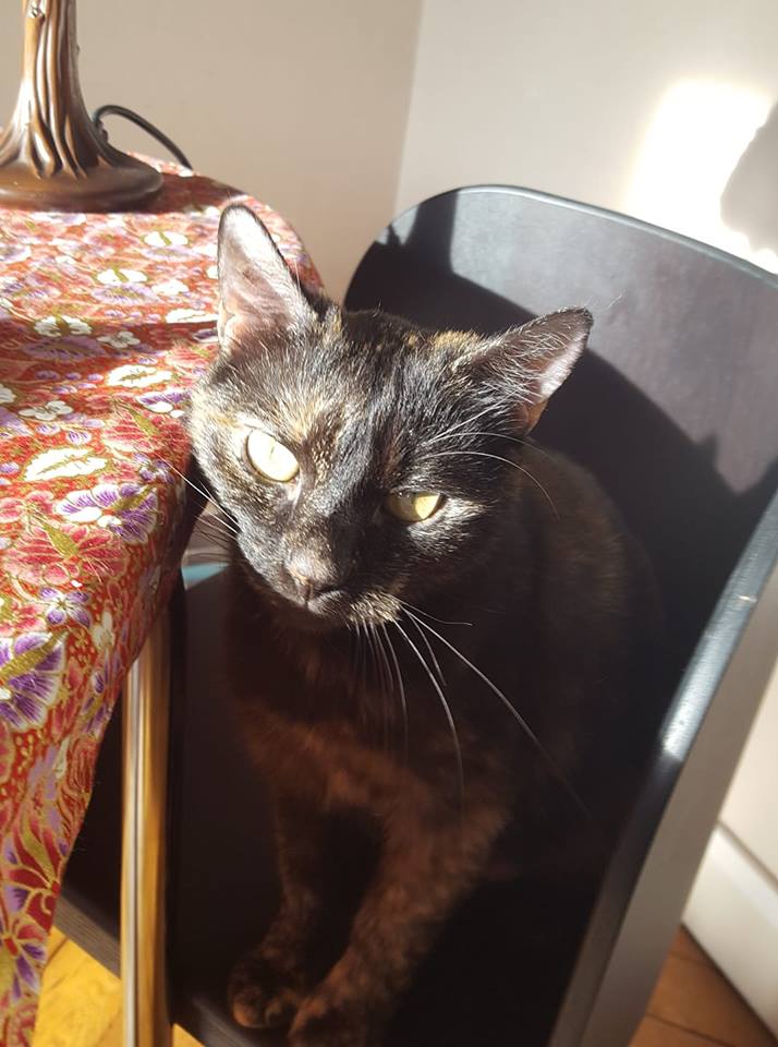 Macha, chatte de 15 ans et végane depuis 4 ans. Mange des croquettes Amicat avec entrain mais aussi des pois chiches, des lentilles, du tempeh, du soja à la japonaise, de la glace à la noix de coco quand elle vole dans mon assiette.
