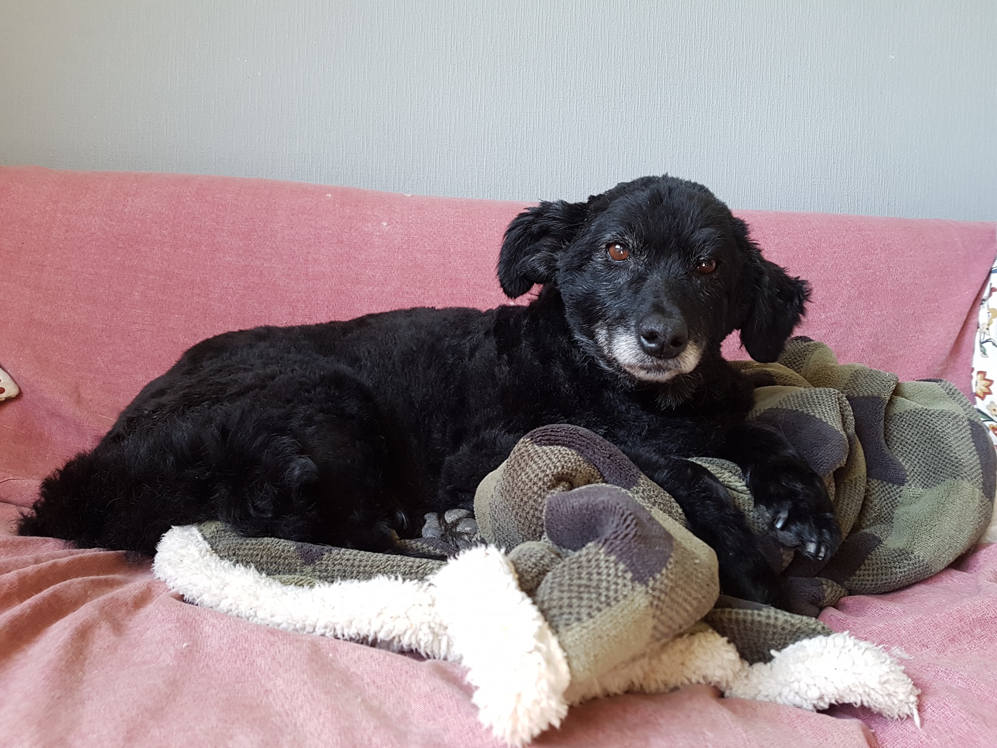 Linda, seize ans et demi, adoptée en janvier 2017 et nourrie depuis cette date aux mêmes croquettes que les copains. Poids : fluctuant, arrivée à 10kg, prise de poids importante à cause d’un traitement à la cortisone de plusieurs mois (elle est montée jusqu’à 23kg), poids actuel et stable depuis plusieurs mois : 18kg. Très peu active, trottine environ trois minutes par jour. Activité préférée : sieste sur le canapé. Niveau santé ça a été plutôt compliqué depuis son arrivée, maladie de peau qu’aucun véto n’a réussi à diagnostiquer jusqu’à octobre dernier, elle l’avait déjà au refuge, a vu des tonnes de vétérinaires ici, des examens à n’en plus finir, une année 2017 qui aura compté 36 visites vétérinaires rien que pour elle ! On m’a conseillé l’euthanasie, on m’a suggéré de changer son alimentation. Sa maladie de peau était déjà présente avant son adoption, ce n’était donc pas lié. Et effectivement, c’est une maladie auto-immune, une adénite sébacée granulomateuse, qui est désormais sous contrôle grâce à un immuno-suppresseur non stéroïdien, la cortisone lui causait des infections urinaires.